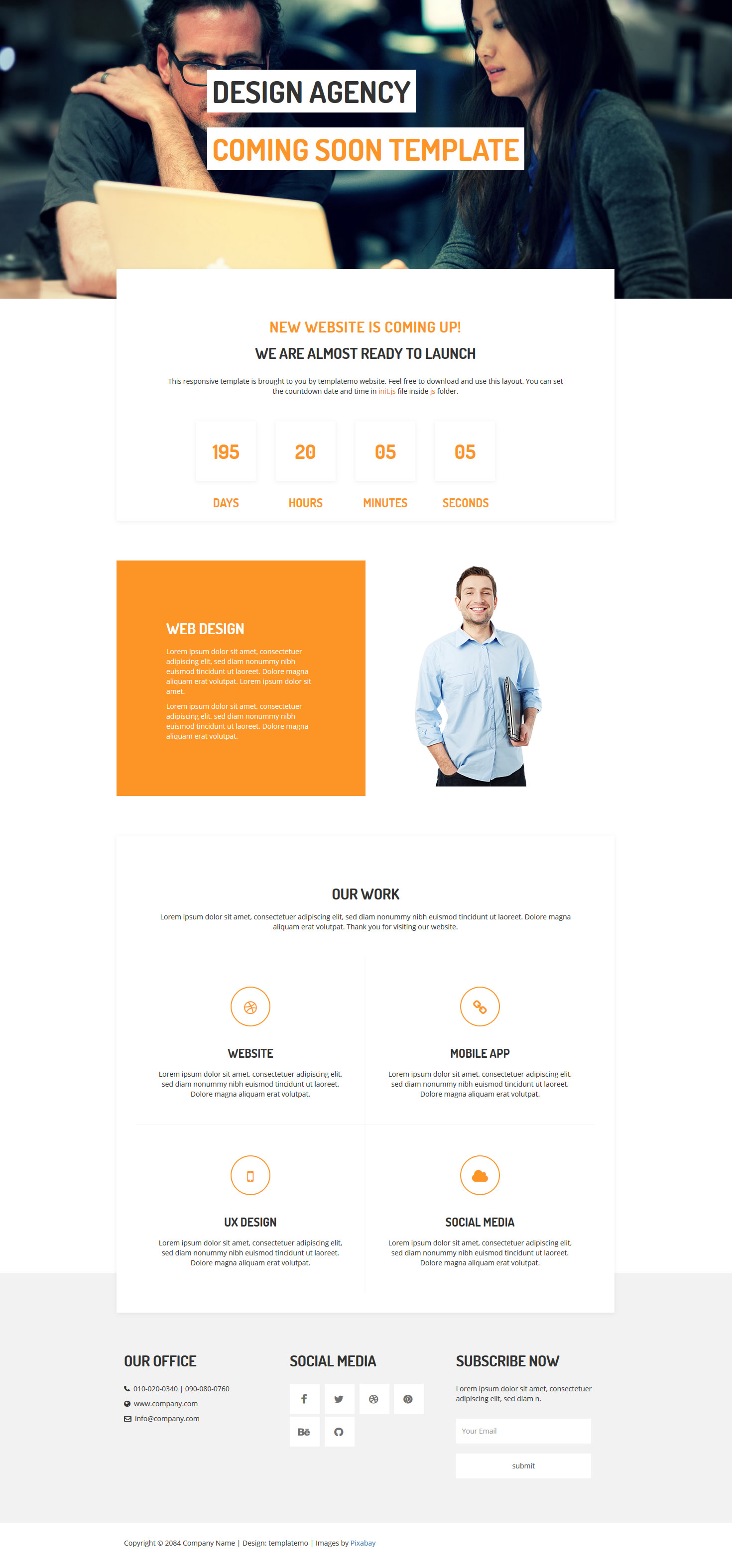 This is an easy way to launch a coming soon page for your business. This is clean, creative design, very easy to customize and based on HTML5 & CSS3 and Bootstrap 3.3.5 and much more.